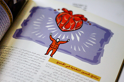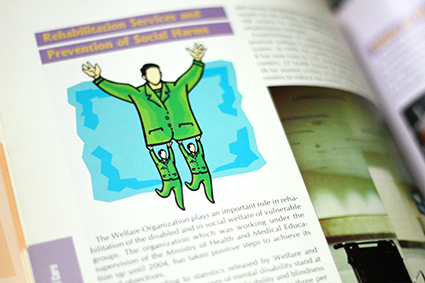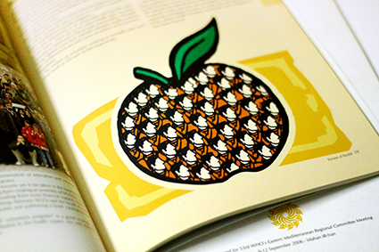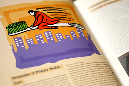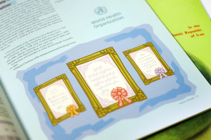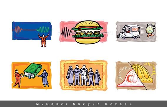 *گاهی اوقات برای تصویرسازی سازی بعضی موضوعات باید از تمام پیرایه ها و پرداختن به جزییات کاست تا طرح به حداقل خطوط و سطوح برسه تا جایی که تصویرسازی نزدیک بشه به یه نشانه {لوگو} تا انتقال سریع تر موضوع مورد نظر و مفهوم و محتوا،بر تکنیک و قلم هنرمند در اولویت باشه. این تصویرسازی ها سال 1385 برای "ویژه نامه سیمای سلامت / پنجاه و سومین اجلاس کمیته منطقه مدیترانه شرقی سازمان بهداشت جهانی" در ایران انجام شد و به تناسب مخاطبان بین المللی و درک همسان از تصاویر،در حدود سی-چهل فریم با موضوعات متنوع عرصه پزشکی و سلامت به این شیوه اجرا گردید. {در دفتر "طراحان فردا" با مدیریت هنری "محمد توکلی عزیز"به سرانجام رسید}